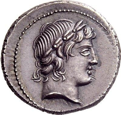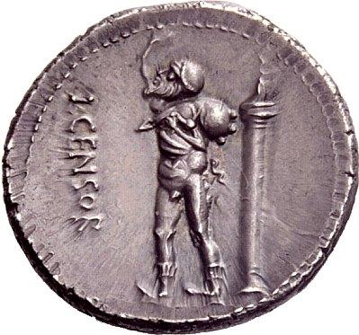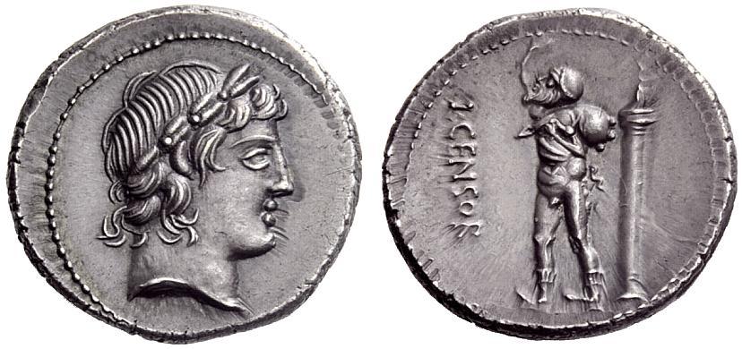 The Roman Republic. L. Marcius Censorinus. Denarius 82, AR 4.13g. Laureate head of Apollo r. Rev. L·CENSOR Marsyas walking l. with r. arm raised and holding wine-skin over l. shoulder; behind, column bearing statue on top. Babelon Marcia 24. Sydenham 737. Crawford 363/1d. Old cabinet tone, virtually as struck and almost Fdc. Ex NAC sale 25, 2003, 289.