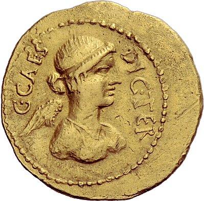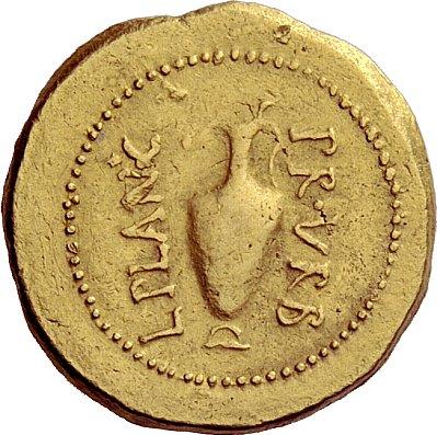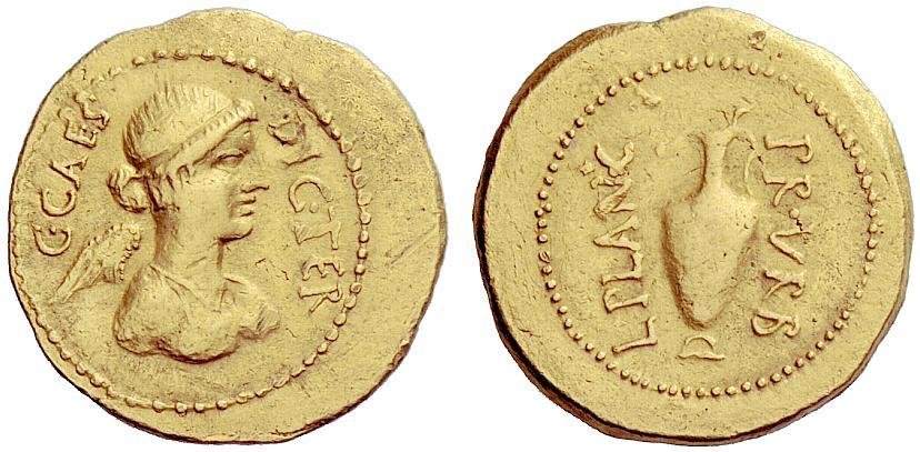 The Roman Republic. L. Munatius Plancus. Aureus 45, AV 8.08g. C·CAES–DIC·TER Diademed and draped bust of Victory r. Rev. L PLANC–PR·VRB Jug. Babelon Julia 18 and Munatia 1. C 30. Bahrfeldt 20 and pl. IV, 10 (these dies). Sydenham 1019b. Sear Imperators 60a. Crawford 475/1b. Calicó 44. Stuck on a broad flan, minor marks on obverse, otherwise good very fine