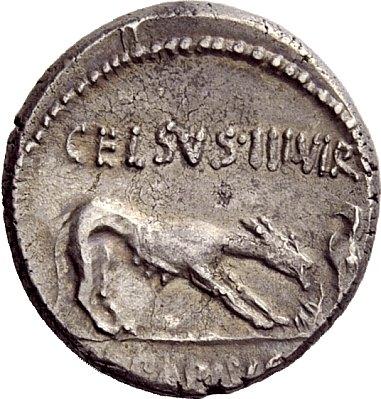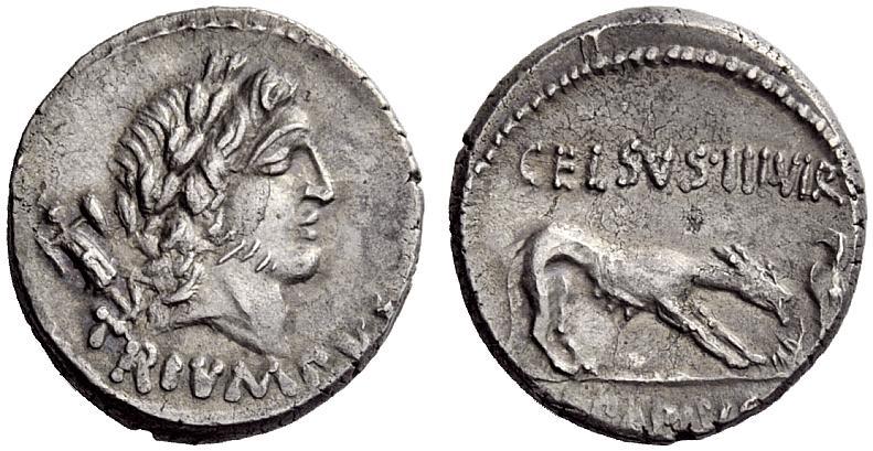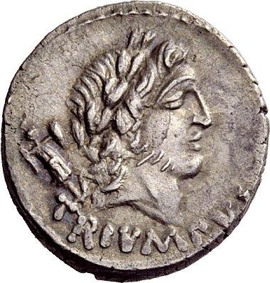 The Roman Republic. L. Papius. Denarius, 45, AR 4.00g. Laureate head of Triumphus r. with trophy over shoulder; below TRIVMPVS. Rev. CELSVS·III·VIR Wolf r., placing stick on fire; on the r., eagle fanning flames. In exergue [L·PAPIVS]. Babelon Papia 3. Sydenham 965. Crawford 472/2. Lightly toned and extremely fine