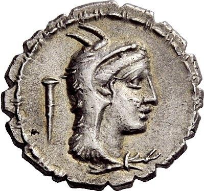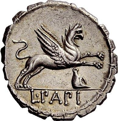 The Roman Republic. L. Papius. Denarius serratus 79, AR 3.80g. Head of Juno Sospita r.; behind, symbol. Rev. Gryphon leaping r.; below, symbol. In exergue, L·PAPI. Babelon Papia 1. Sydenham 773. Crawford 384/1 and symbols pl. LXVII, 155. Extremely fine