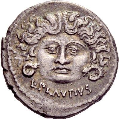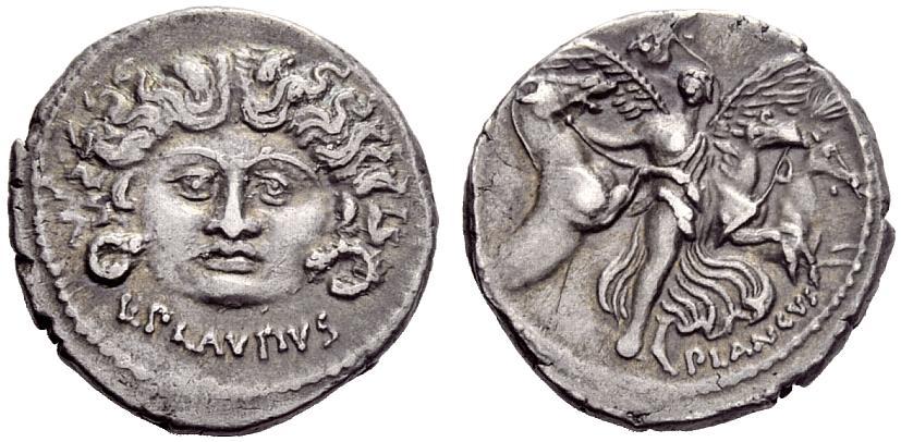 The Roman Republic. L. Plautius Plancus. Denarius 47, AR 3.95g. Head of Medusa facing; with coiled snake on either side below, L·PLAVTIVS. Rev. Victory facing holding palm branch in l. hand and leading four horses; below, PLANCVS. Babelon Plautia 15. Sydenham 959. Sear Imperators 29. Crawford 453/1a. Unusually well centred and complete, old cabinet tone and extremely fine