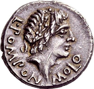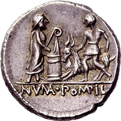 The Roman Republic. L. Pomponius Molo. Denarius 97, AR 4.11g. Laureate head of Apollo r.; around, L·POMPON·MOLO. Rev. Numa Pompilius holding lituus behind lighted altar to which victimarius leads goat. In exergue, NVMA·POMPIL. Babelon Pomponia 6. Sydenham 607. Crawford 334/1. Magnificent old cabinet tone. Virtually as struck and almost Fdc