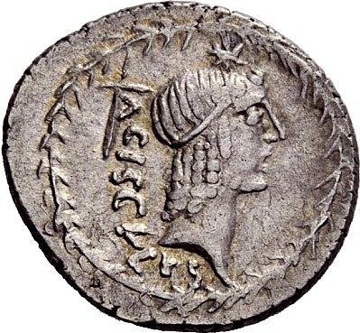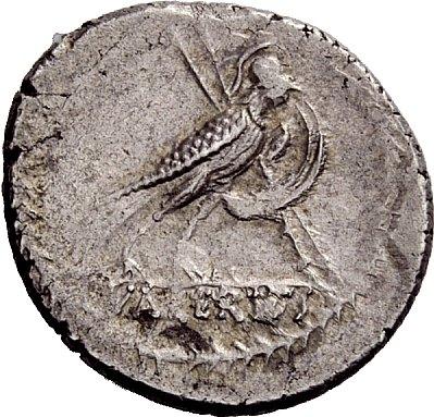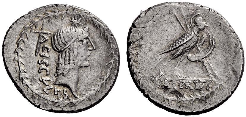 The Roman Republic. L. Valerius Acisculus. Denarius 45, AR 3.69g. ACISCVLVS Head of Apollo r., hair tied with band; above, star and behind, acisculus. All within laurel wreath. Rev. Helmeted human-headed owl r., carrying shield and two spears; in exergue, L·VALERIVS. Babelon Valeria 18. Sydenham 999a. Sear Imperators 91a. Crawford 474/2b. Very rare. Lightly toned and extremely fine. Ex NAC sale 46, 2008, 433.