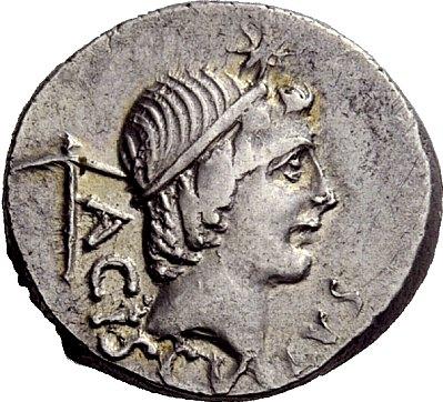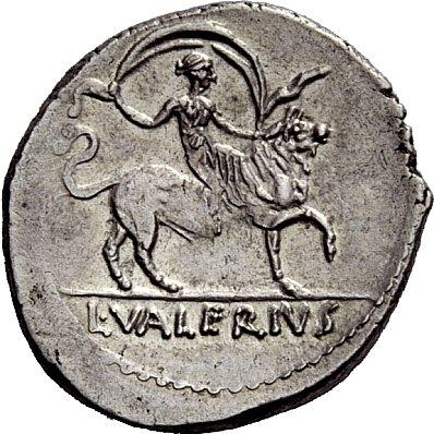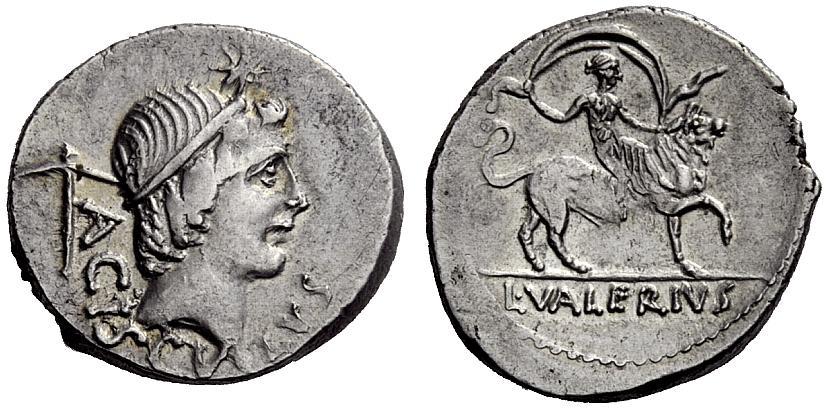 The Roman Republic. L. Valerius Acisculus. Denarius 45, AR 3.85g. Head of Apollo r., hair tied with band; above, star and behind, acisculus. Rev. Europa seated on bull walking r. Babelon Valeria 17. Sydenham 998. Sear Imperators 90. Crawford 474/1a. About extremely fine / extremely fine