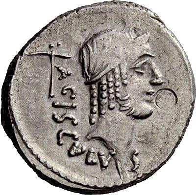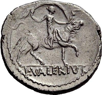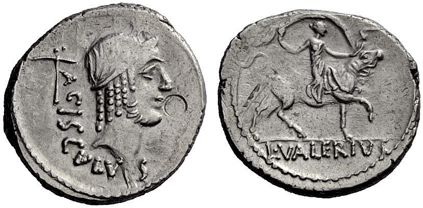 The Roman Republic. L. Valerius Acisculus. Denarius 45, AR 3.85g. Head of Apollo r., hair tied with band; above, star and behind, acisculus. Rev. Europa seated on bull walking r. Babelon Valeria 17. Sydenham 998. Sear Imperators 90. Crawford 474/1a. A minor countermark on obverse field, very fine