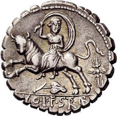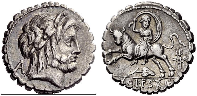 The Roman Republic. L. Volteius L.f. Strabo. Denarius serratus 81, AR 3.91g. Laureate head of Jupiter r.; behind, A. Rev. Europa seated on bull charging l.; behind, winged thunderbolt and below, ivy leaf. In exergue, [L·]VL·O·L·F·STRAB. Babelon Volteia 6. Sydenham 743. Crawford 377/1. Rare. Attractively toned and extremely fine