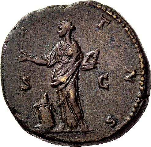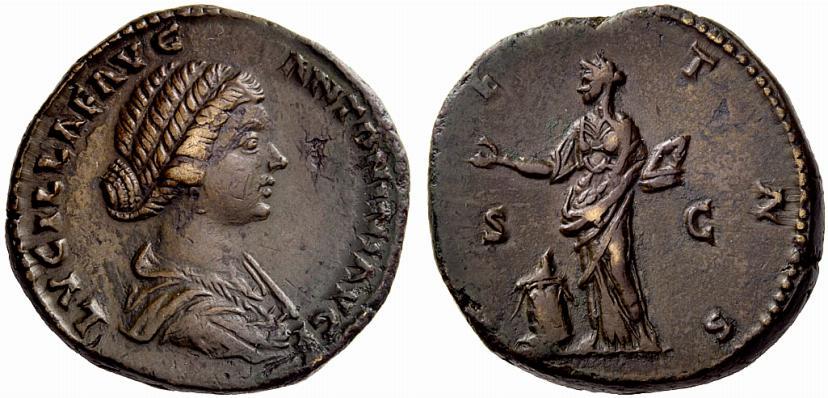 The Roman Republic. Lucilla, wife of Lucius Verus. Sestertius from 164, Æ 24.76g. Draped bust r. Rev. Pietas, veiled, standing l., raising r. hand over lighted altar and holding a perfume-box. C 54. BMC M. Aurelius 1164. RIC M. Aurelius 1756. Brown tone, good very fine