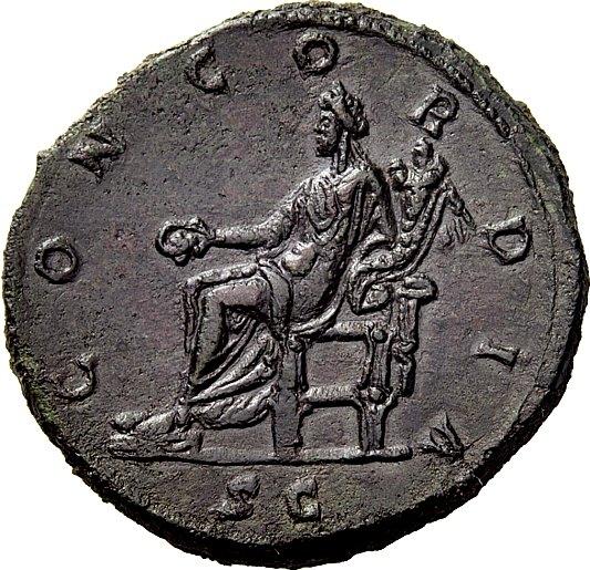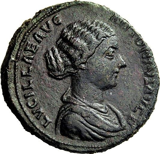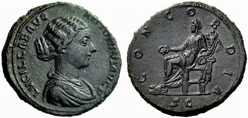 The Roman Republic. Lucilla, wife of Lucius Verus. Sestertius from 164, Æ 25.60g. Draped bust r. Rev. Concordia seated l., holding patera and cornucopiae. C 8. BMC M. Aurelius 1140. RIC M. Aurelius 1730. Brown-green patina somewhat tooled, otherwise good very fine