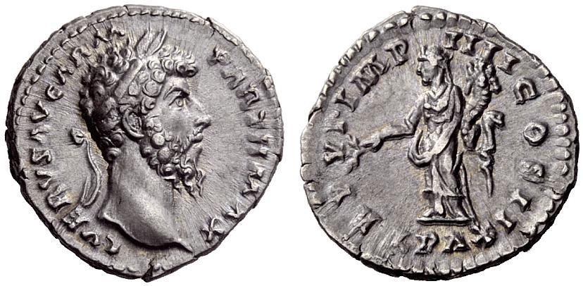 The Roman Republic. Lucius Verus, 161–169. Denarius 165-166, AR 3.44g. Laureate head r. Rev. Pax standing l., holding branch and cornucopiae. C 126. BMC 428. RIC M. Aurelius 561. Extremely fine
