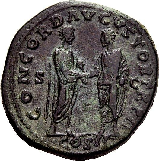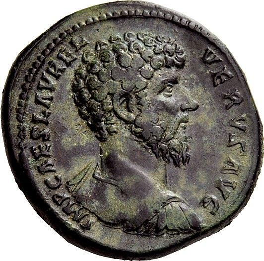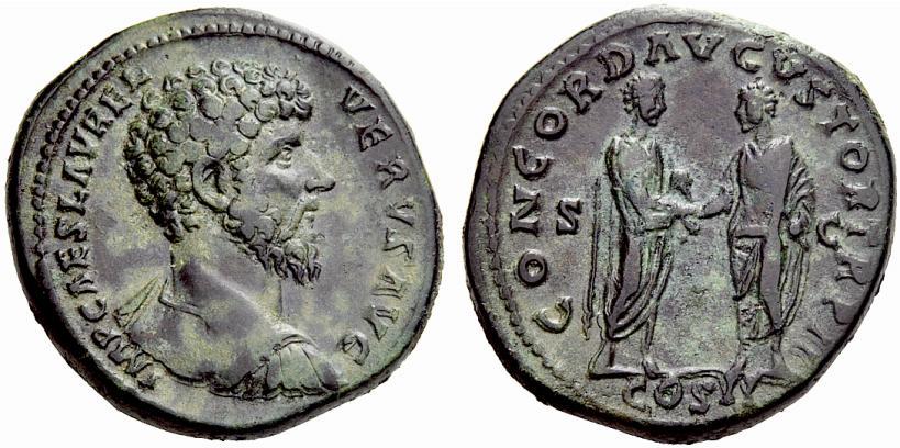 The Roman Republic. Lucius Verus, 161–169. Sestertius 161-162, Æ 27.39g. Bare-headed and cuirassed bust r. Rev. M. Aurelius and L. Verus clasping hands. C 38. BMC 1023 note. RIC M. Aurelius 1310. Light green patina and good very fine