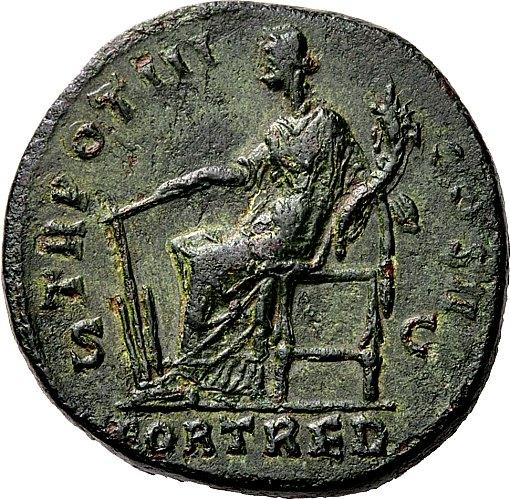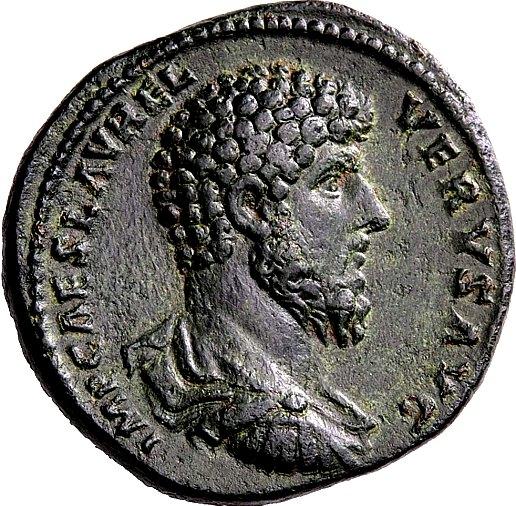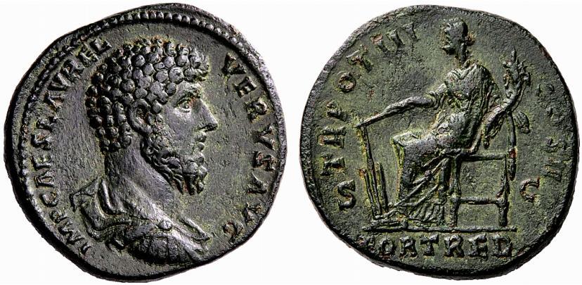 The Roman Republic. Lucius Verus, 161–169. Sestertius 162-163, Æ 27.91g. Bare-headed, draped and cuirassed bust r. Rev. Fortuna seated l., holding rudder and cornucopiae. C 91. BMC 1056. RIC M. Aurelius 1342. Green patina somewhat tooled on reverse, otherwise good very fine / very fine