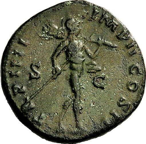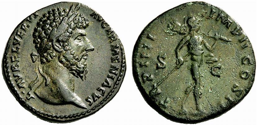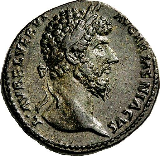 The Roman Republic. Lucius Verus, 161–169. Sestertius 163-164, Æ 26.25g. Laureate bust r. Rev. Mars advancing r., holding spear and trophy. C 232. BMC 1047. RIC M. Aurelius 1346. Green patina, weakly struck on reverse, otherwise about extremely fine / good very fine