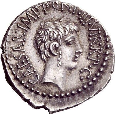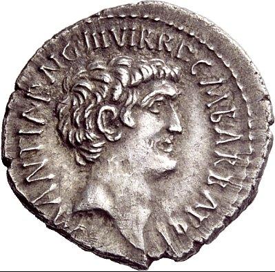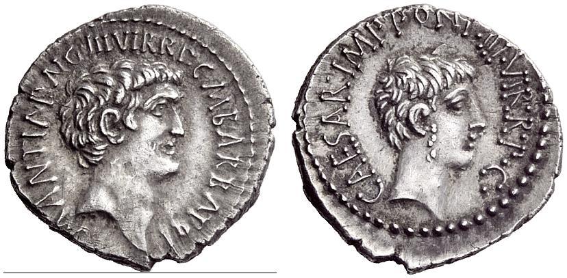 The Roman Republic. M. Antonius and Octavianus with M. Barbatius. Denarius, mint moving with M. Antonius 41, AR 3.70g. M·ANT·IMP·AVG·III·VIR·R·P·C·M BARBAT·Q·P Head of M. Antonius r. Rev. CAESAR IMP PONT·III·VIR·R·P·C Head of Octavian r. with slight beard. Babelon Antonia 51, Julia 96 and Barbatia 2. C 8. Sydenham 1181. Sear Imperators 243. Crawford 517/2. Lightly toned and extremely fine. Ex NAC sale 33, 2006, 387