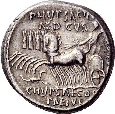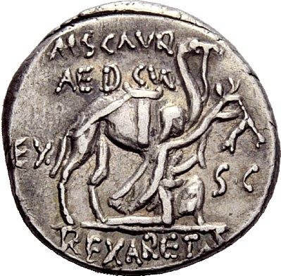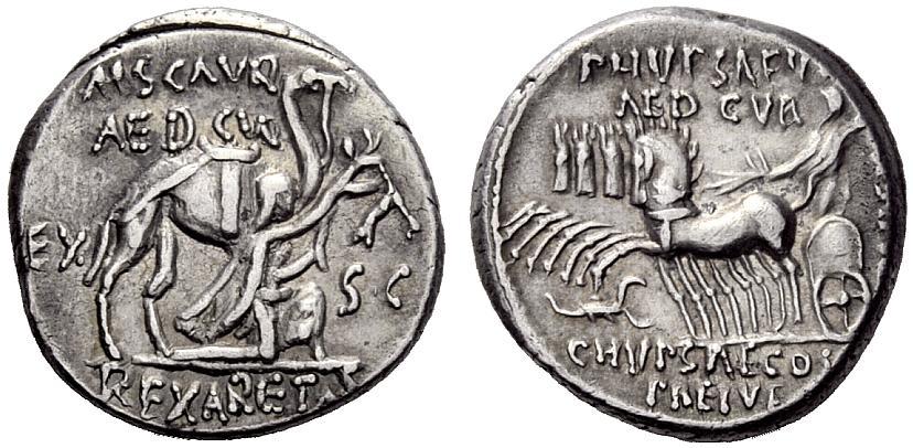 The Roman Republic. M. Aemilius Scaurus, P. Plautius Hypsaeus. Denarius 58, AR 3.95g. M·SCAVR / AED CVR Kneeling figure r., holding olive branch and reins of camel standing beside him; in field, EX–S·C and in exergue, REX ARETAS. Rev. P·HVPSAE / AED CVR Jupiter in quadriga l. holding reins in l. hand and hurling thunderbolt with r.; behind, [CAPTV]. Below, C HVPSAE COS / PREIVE. Babelon Aemilia 8 and Plautia 8. Sydenham 913. Crawford 422/1b. Iridescent tone and extremely fine