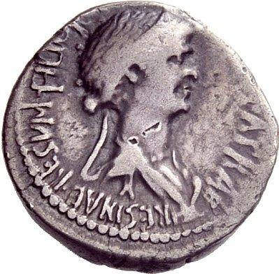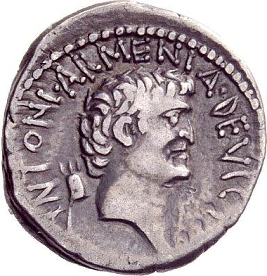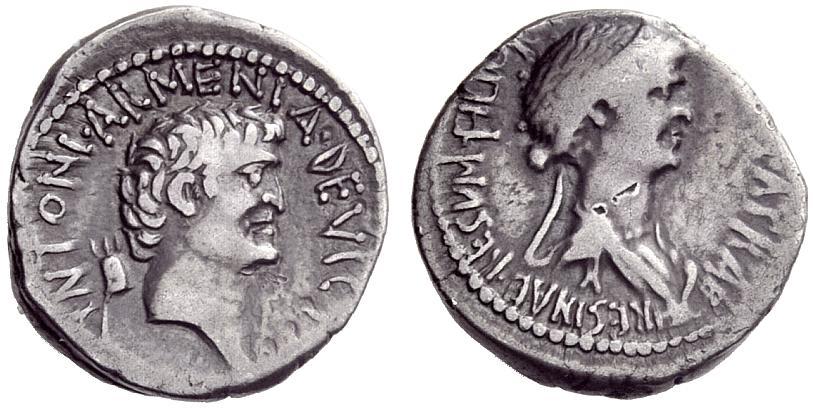 The Roman Republic. M. Antonius and Cleopatra. Denarius, mint moving with M. Antonius 32, AR 3.74g. Head of M. Antonius r.; behind, Armenian tiara. Rev. Draped and diademed bust of Cleopatra r. Babelon Antonia 95. C 1. Sydenham 1210. Sear Imperators 345. Crawford 543/1. Old cabinet tone, area of weakness and countermark on reverse, otherwise good very fine / about very fine