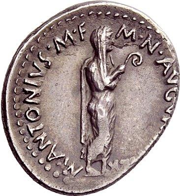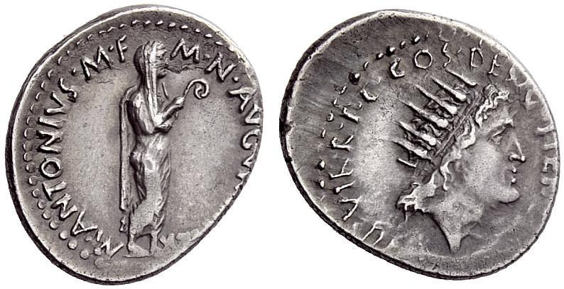 The Roman Republic. M. Antonius. Denarius, mint moving with M. Antonius in 38, AR 3.77g. M·ANTONIVS·M·F-M·N·AVG[VR·IMP·TER·] M. Antonius veiled and togate, standing r. and holding lituus in r. hand. Rev III·VIR·R·P·C·COS·DESIG·ITER·[ET·TERT] Radiate head of Sol r. Babelon Antonia 80. C 13. Sydenham 1199. Sear Imperators 267. Crawford 533/2. Attractively toned, slightly off-centre, otherwise extremely fine