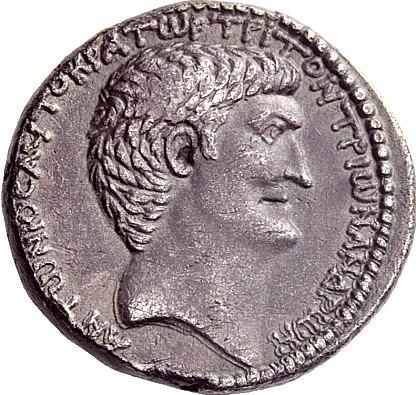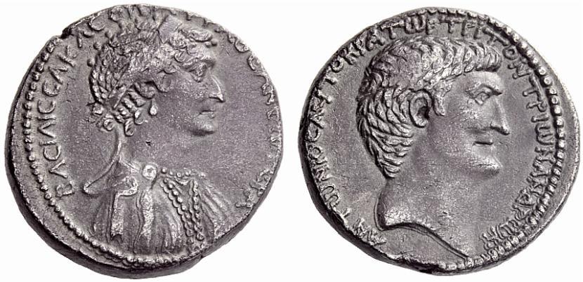 The Roman Republic. M. Antonius. Tetradrachm, Antiochia ad Orontem Syriae secondary mint (?) ca. 36, AR 14.01g. BACILICCA KLEOPATRAC QEA NEWTERA Diademed bust of Cleopatra r. Rev. ANTWNIOC AYTOKPATWR TRITON TRIWN ANDRWN Bare head of M. Antonius r. C 2. BMC 53. RPC 4094. Prieur 27. Kraay-Hirmer pl. 220, 809. Butcher, Coinage in Roman Syria p. 57, fig. 8.1. Very rare and among the finest specimens known. Two magnificent portraits struck on an unusually good metal for this issue. Toned and about extremely fine. Ex Ira & Larry Goldberg sale 47, 2008, 1285. As the struggle between Mark Antony and Octavian dragged on in the 30s B.C., the geographical and political lines became ever more defined. Antony had become entrenched in the Eastern Mediterranean, and in doing so had allied himself with Cleopatra VII, queen of Egypt, whose original supporter in Rome, Julius Caesar, had been murdered years before. She had his son, Caesarion, at her side, but she needed an ally like Antony if she hoped to preserve Egypt from the ever-widening grasp of Rome. Importantly, Antony was easier to manipulate than Octavian, who had no sympathy for Cleopatra’s motives. Although this woman of blinding intellect may have found her marriage to Antony a degrading experience, personally, she was crafty enough to realise it was her only chance at survival. Hence, she was probably eager to issue dual-portrait coins, such as the billon tetradrachm offered here. The level of concession is clear, especially on this example: Cleopatra’s portrait has taken on the facial features of Antony in a very strong way, yet she retains for herself the position of dominance by placing her portrait on the obverse. Little more indication is necessary to recognise that Cleopatra had effectively dominated her husband, the Roman warlord Antony. The date and mint of these coins is uncertain, as the coins themselves provide no substantial clue. They are typically described as having been struck at Antioch, though there is good reason to believe that they were produced further south, in Cleopatra’s Phoenician territory. The date c. 36 B.C. has been suggested, and is generally believed appropriate. If so, we might see this coinage as supporting Antony’s invasion of Parthia–a colossal failure that cost the lives of many thousands of Roman soldiers.