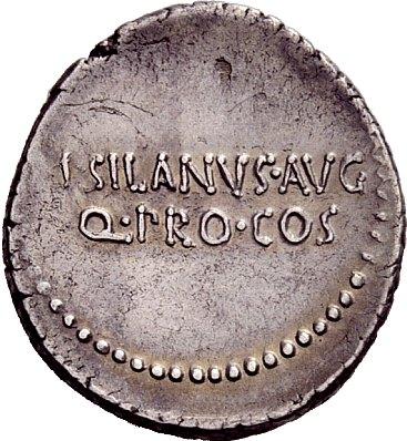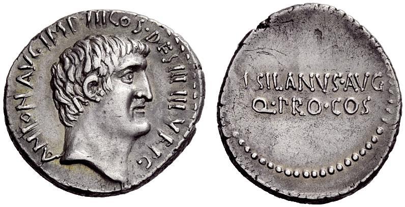 The Roman Republic. M. Antonius and M. Junius Silanus. Denarius, mint moving with M. Antonius in 33, AR 3.81g. ANTON AVG IMP·IIICOS·DES·III·III·V·R·P C. Head of M. Antonius r. Rev. M·SILANVS·AVG / Q·PRO·COS. Babelon Antonia 97 and Junia 172. C 71. Sydenham 1208. Sear Imperators 346. Crawford 542/1. Bold portrait, nice cabinet tone and extremely fine