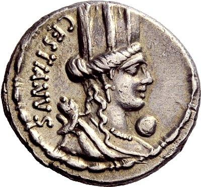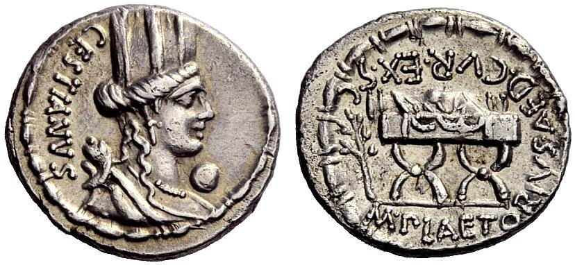 The Roman Republic, M. Plaetorius M.f. Caestianus. Denarius 67, AR 3.66 g. CESTIANVS Bust of Cybeles r.; behind, forepart of lion. Before chin, globe. Bead and reel border. Rev. M PLAETORIVS AED CVR EX·S·C Curule chair; in l. field, branch. Bead and reel border. Babelon Plaetoria 3. Sydenham 808. Crawford 409/2. Slightly porous on reverse, otherwise about extremely fine