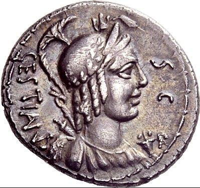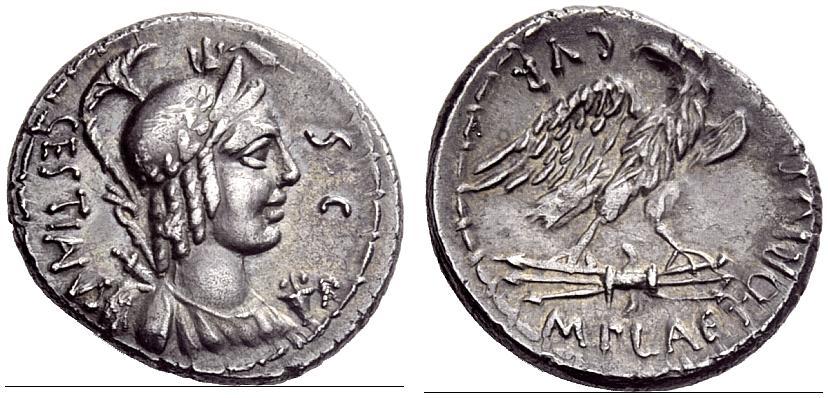 The Roman Republic. M. Plaetorius M.f. Caestianus. Denarius 67, AR 3.91g. Bust r. with the attributes of Isis, Minerva, Apollo, Diana and Victory; before, cornucopiae and S C. Behind, CESTIANVS. Rev. Eagle on thunderbolt; around, M·PLAETORIVS·M·F·AED·CVR. Babelon Plaetoria 4. Sydenham 809. Crawford 409/1. Old cabinet tone and good extremely fine