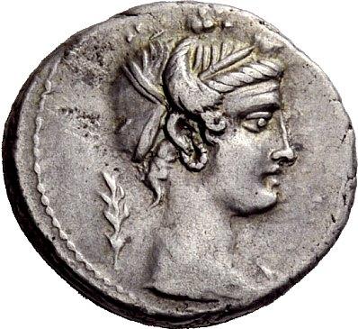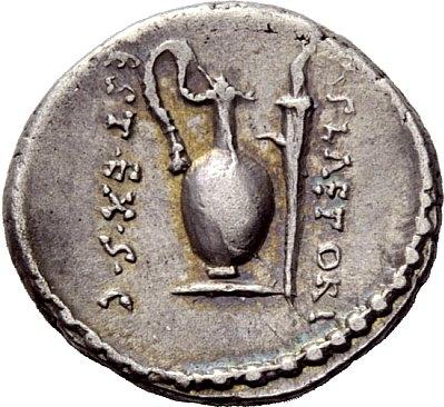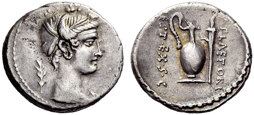 The Roman Republic, M. Plaetorius M. f. Cestianus. Denarius 69. AR 3.88 g. Draped female bust r., hair decorated with poppy heads.; behind, palm branch. Rev. Jug and torch; on r., M·PLAETORI, on l., CEST·EX·S·C. Babelon Plaetoria 7. Sydenham 803. Crawford 405/4b. Lightly toned, about extremely fine / extremely fine