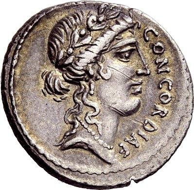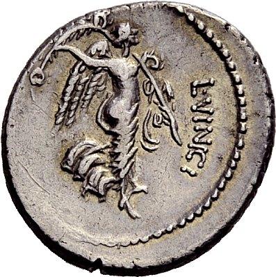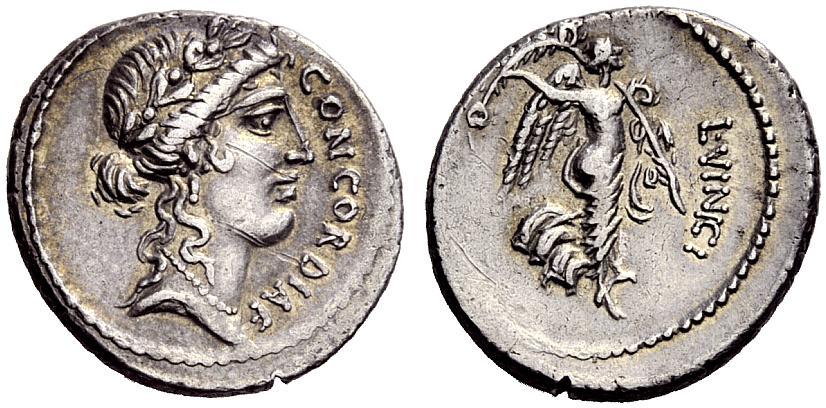The Roman Republic, M. Vinicius. Denarius 52, AR 3.91 g. CONCORDIAE Laureate head of Concordia r. Rev. L·VINICI Victory walking r., carrying palm branch decorated with four wreaths. Babelon Vinicia 1. Sydenham 930. Crawford 436/1. Lightly toned. Two scratches on obverse, otherwise about extremely fine