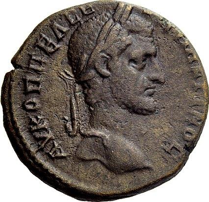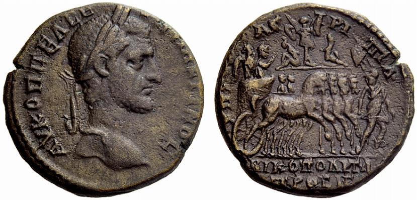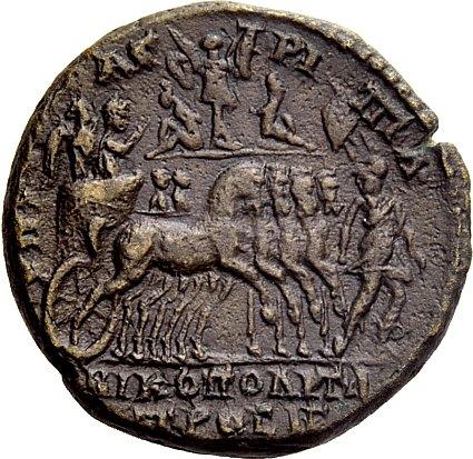 The Roman Republic. Macrinus, 217–218. Bronze, Nikopolis Moesiae Inferioris 217-218, Æ 11.59g. Laureate head r. Rev. The Emperor with Victory at his side, in quadriga r., preceded by Roma; in the background, Trophy with captives. AMNG I, 1713. Brown tone and very fine / good very fine