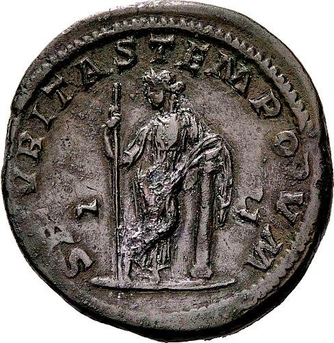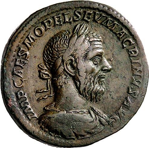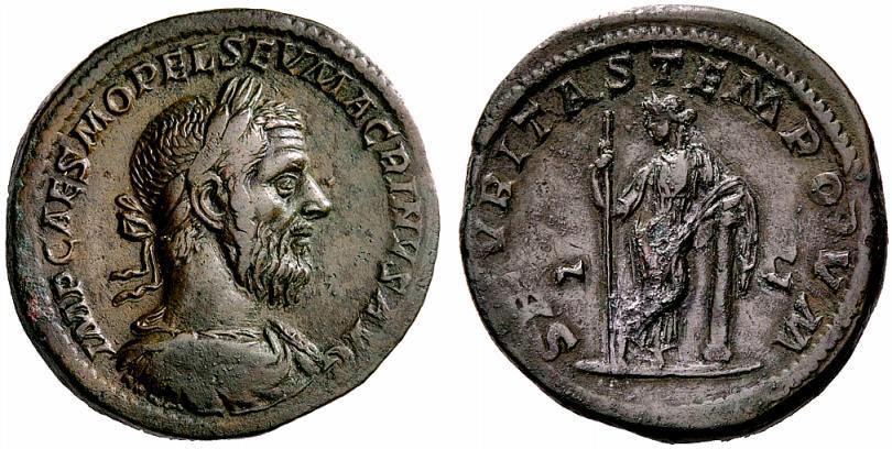 The Roman Republic. Macrinus, 217–218. Sestertius 217-218, Æ 25.66g. Laureate draped and cuirassed bust r. Rev. Securitas standing facing, head l., holding sceptre and leaning on column. C 123. BMC 105 var. (no drapery). RIC 202. A bold portrait, brown-green patina and good very fine