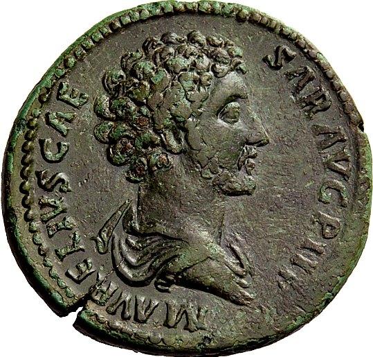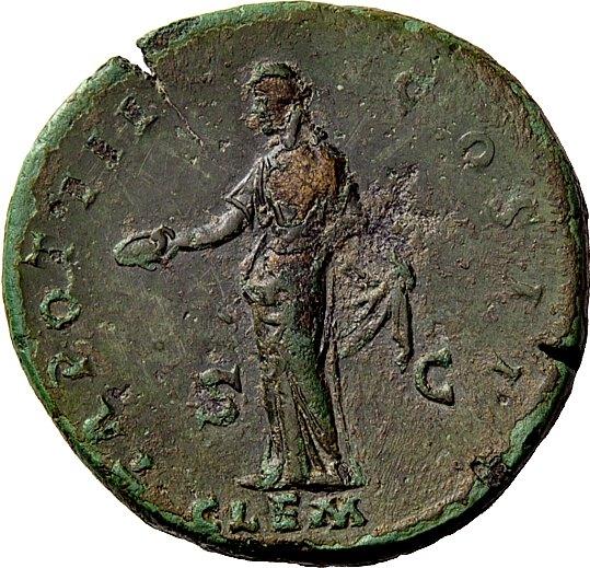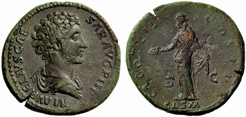 The Roman Republic. Marcus Aurelius caesar, 139–161. Sestertius 147-148, Æ 24.09g. Bare-headed and draped bust r. Rev. Clementia standing l., holding patera and raising skirt. C 17 var. BMC A. Pius 1844 var. RIC A. Pius 1277. Light green patina and very fine. NAC sale 46, 2008, 1084.