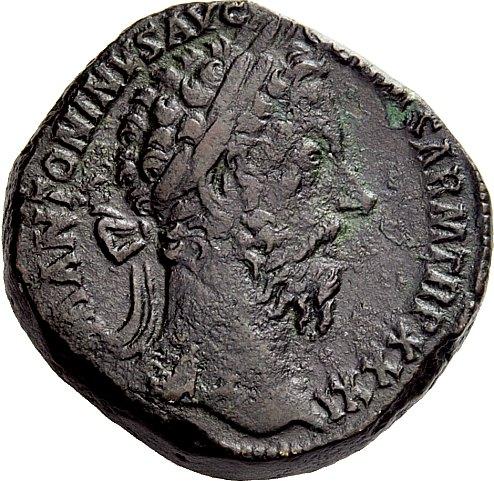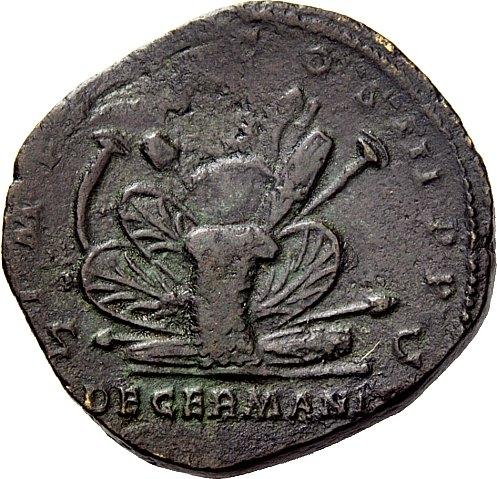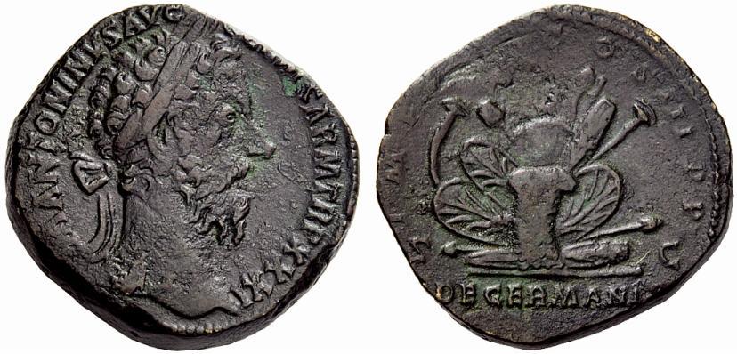 The Roman Republic. Marcus Aurelius augustus, 161–180. Sestertius 177, Æ 23.27g. Laureate head r. Rev. Pile of arms. C 163. BMC 1596. RIC 1184. Dark tone, metal flaw on reverse and about very fine