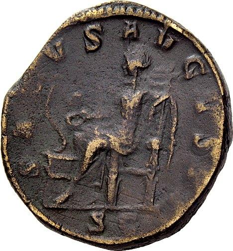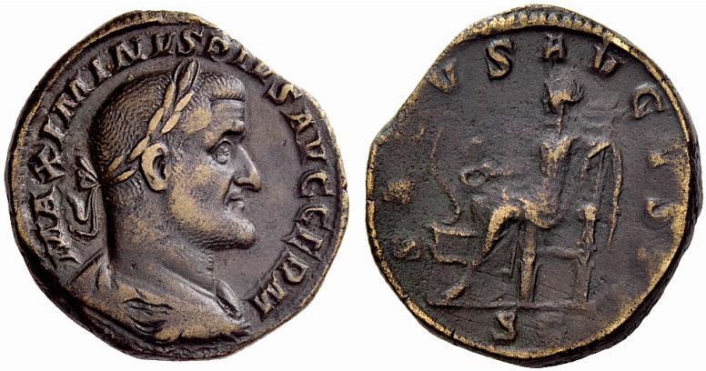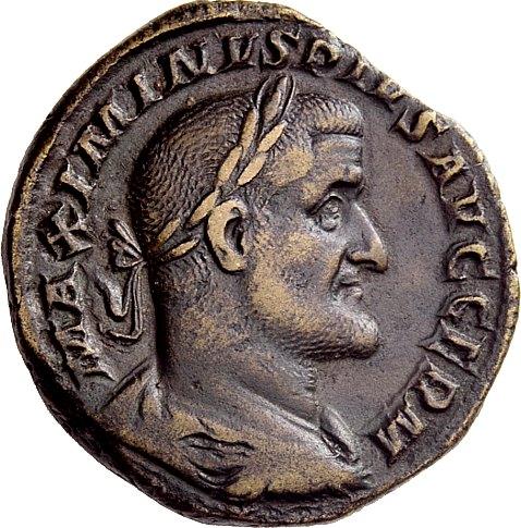 The Roman Republic. Maximinus I, 235–238. Sestertius 236-237, Æ 20.70g. Laureate, draped and cuirassed bust r. Rev. Salus seated l., feeding out of patera snake coiled around altar. C 92. BMC 176. RIC 85. Brown tone and very fine