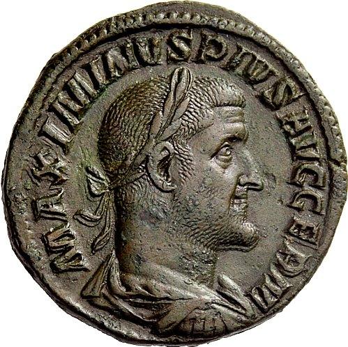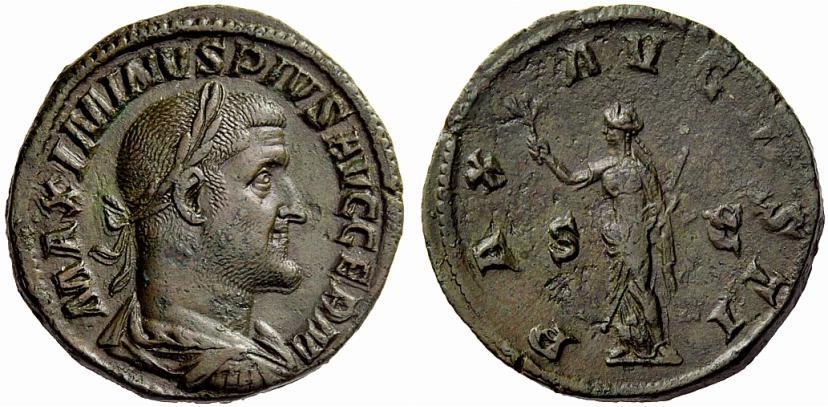 The Roman Republic. Maximinus I, 235–238. Sestertius January 236-237, Æ 21.65g. Laureate, draped and cuirassed bust r. Rev. Pax standing l., holding branch and transverse sceptre. C 38. BMC 148. RIC 81. Lovely olive green patina and about extremely fine