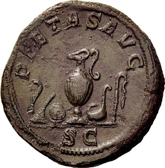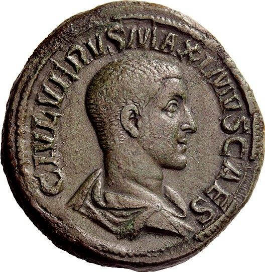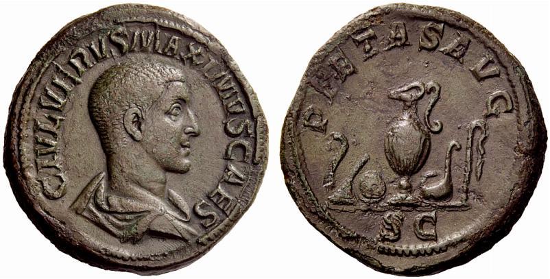 The Roman Republic. Maximus caesar, 236–238. Sestertius 236, Æ 22.54g. Bare-headed and draped bust r. Rev. Priestly emblems. C 5. BMC Maximinus 119. RIC 6. Olive green patina gently tooled, otherwise about extremely fine