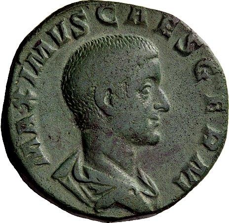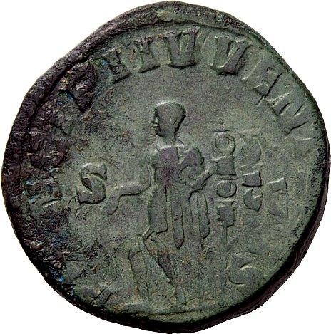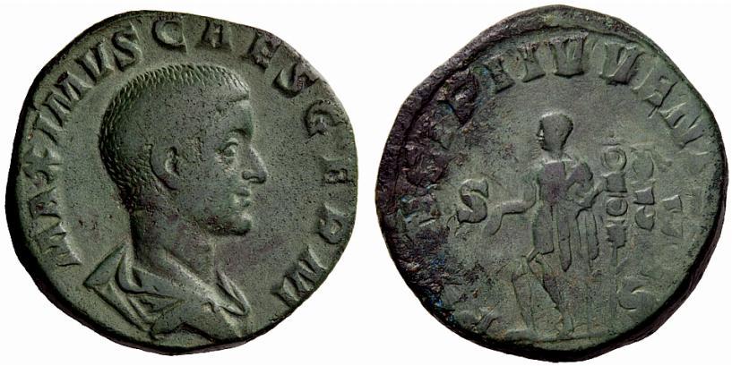 The Roman Republic. Maximus caesar, 236–238. Sestertius 236-237, Æ 20.80g. Bare-headed and draped bust r. Rev. Maximus standing l., holding baton in r. hand and traverse spear in l.; behind, two standards. C 14. BMC Maximinus 213. RIC 13. Pleasant light green patina, very fine