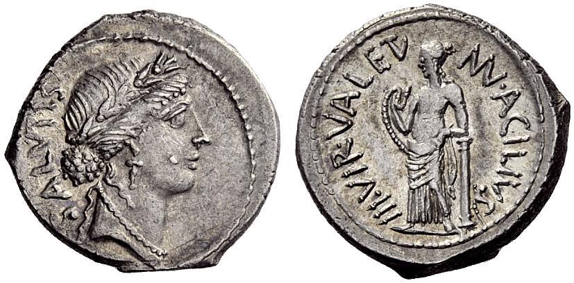 The Roman Republic. Mn. Acilius Glabrio. Denarius 49, AR 3.92g. Laureate head of Salus r. Rev. Valetudo standing l., resting l. arm on column and holding snake in r. hand. Babelon Acilia 8. Sydenham 922. Crawford 442/1a About extremely fine