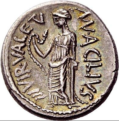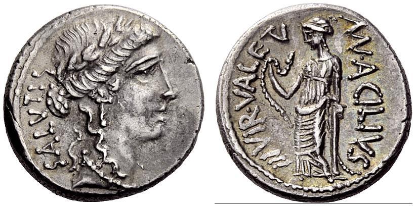 The Roman Republic. Mn. Acilius Glabrio. Denarius 49, AR 4.24g. SALVTIS Laureate head of Salus r. Rev. MN·ACILIVS–III·VIR VALETV Valetudo standing l., resting l. arm on column and holding snake in r. hand. Babelon Acilia 8. Sydenham 922. Crawford 442/1a. Lightly toned and about extremely fine
