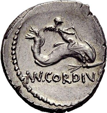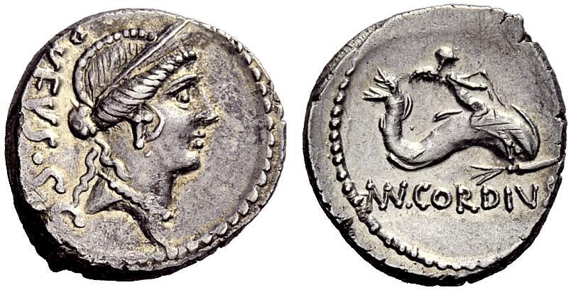 The Roman Republic, Mn. Cordius Rufus. Denarius 46, AR 3.88 g. RVFVS·S·C· Diademed head of Venus r. Rev. Cupid on dolphin r.; below, MN.CORDIVS. Babelon Cordia 3. Sydenham 977. Sear Imperators 65. Crawford 463/3. Lightly toned, minor scratches on reverse, otherwise extremely fine