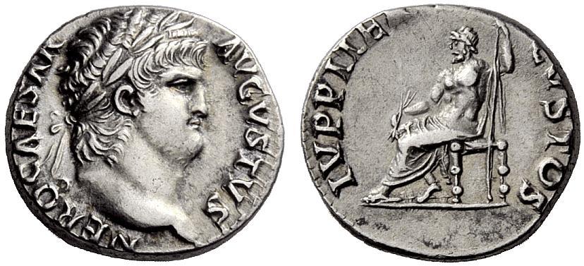The Roman Republic. Nero augustus, 54–68. Denarius ca. 64-66, AR 3.29g. Laureate head r. Rev. Jupiter seated l. on throne, holding thunderbolt and sceptre. C 119. BMC 74. RIC 153. Good very fine