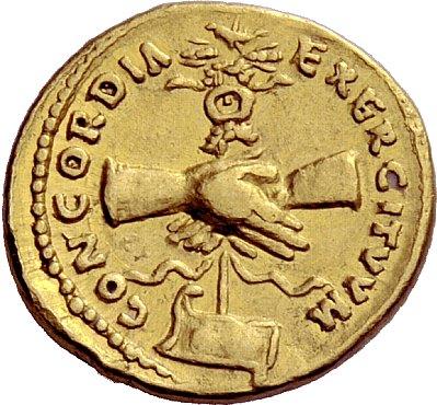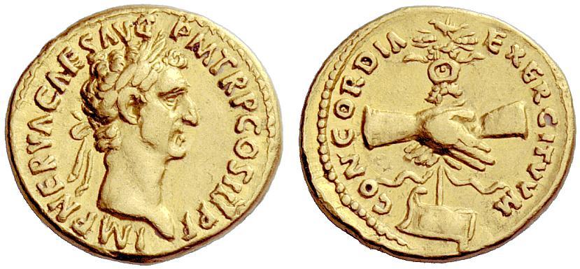 The Roman Republic. Nerva, 96–98. Aureus 97, AV 7.49 g Laureate head r. Rev. Clasped hands over aquila set on prow. C 28. BMC 27. RIC 15. Calicó 958. Rare. Good very fine