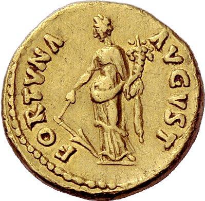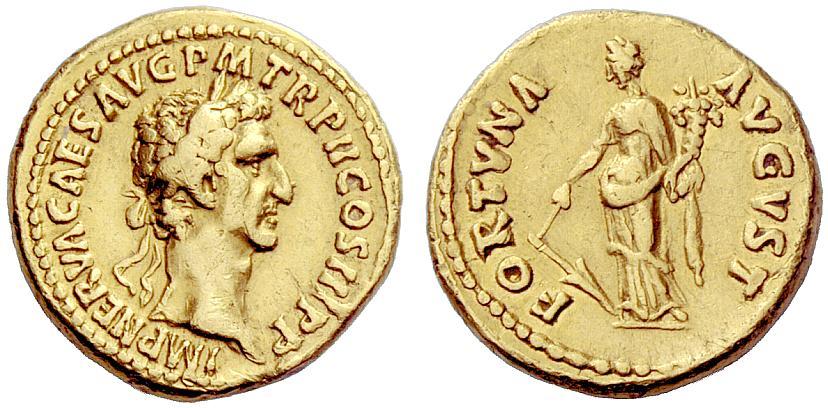 The Roman Republic. Nerva, 96–98. Aureus 97, AV 7.49 g Laureate head r. Rev. Fortuna standing l. holding rudder and cornucopiae. C 70. BMC 60 var. (drapery on l. shoulder). RIC 28. Calicó 965. Rare. Good very fine / very fine. Ex Gorny & Mosch sale 169, 2008, 280.