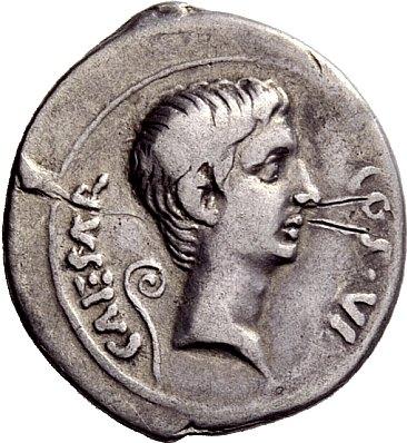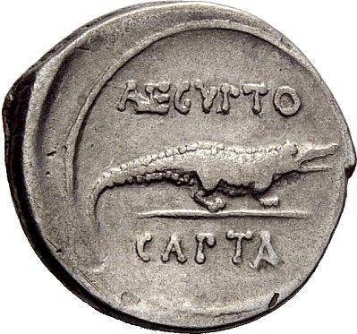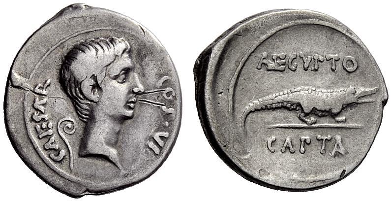 The Roman Republic. Octavian, 32–27 BC. Denarius, Brundisium or Roma 28, AR 3.53g. Bare head r.; behind, lituus. Rev. Crocodile r. C 2. BMC 650. RIC 275a. CBN 905 (Ephesus). Very rare.Lightly toned, two scratches on obverse, otherwise good very fine