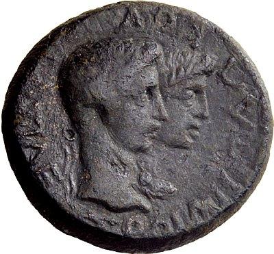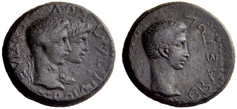 The Roman Republic. Octavian as Augustus, 27 BC–14 AD. Bronze, Thrace ca. 11 BC-12 AD, Æ 8.76g. Jugate and diademed bust of Rhoemetalces and draped bust of Pythadoris r. Rev. Bare head of Augustus r. RPC 1711. Dark green patina and very fine