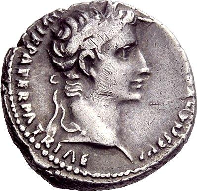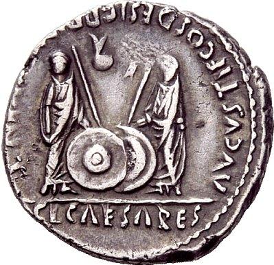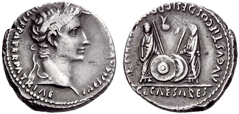 The Roman Republic. Octavian as Augustus, 27 BC–14 AD. Denarius, Lugdunum 2 BC-4 AD, AR 3.78g. Laureate head r. Rev. Gaius and Lucius caesares standing facing, resting hands on shield; behind each shield a spear. Above on l., simpulum, and on r., lituus. C 43. BMC 533. RIC 207. CBN 1651 Toned and very fine