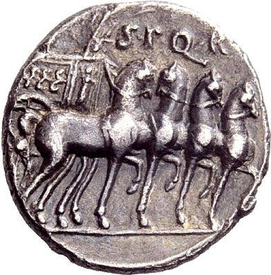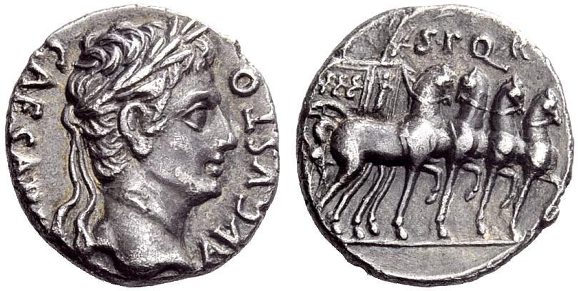 The Roman Republic. Octavian as Augustus, 27 BC–14 AD. Denarius, Colonia Patricia ca. 18 BC, AR 3.75g. Laureate head r. Rev. Slow quadriga r. containing aquila and surmounted by four miniature galloping horses. C 275 var. BMC 394 var. RIC 110. CBN –. Rare. Old cabinet tone, about extremely fine
