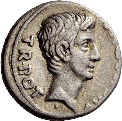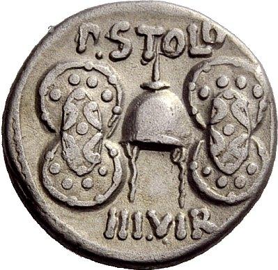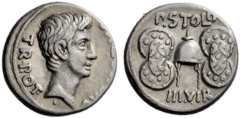 The Roman Republic. Octavian as Augustus, 27 BC–14 AD. P. Licinius Stolo. Denarius ca. 17 BC, AR 3.68g. Bare head r. Rev. Apex between two studded ancilia. C 438. BMC 74. RIC 343. CBN 296. Rare. Good very fine