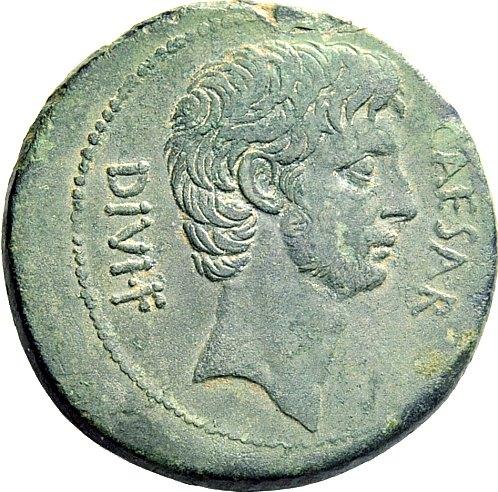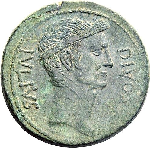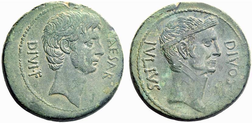 The Roman Republic. Octavianus. Bronze, Italy 38, Æ 16.95g. CAESAR–DIVI·F Bare head of Octavian r. Rev. DIVOS–IVLIVS Laureate head of Julius Caesar r. Babelon Julia 98. C 3. Sydenham 1336. Kent-Hirmer pl. 33, 115. Crawford 535/1. RPC 620. Two delightful portraits and a lovely light green patina. About extremely fine / extremely fine. Ex NAC sale 21, 2001, 322.