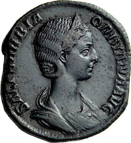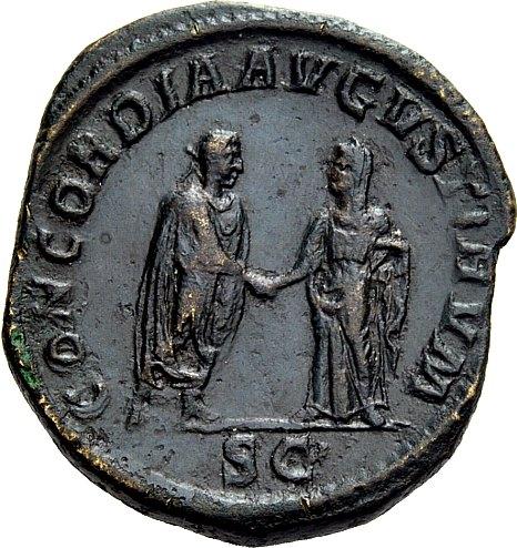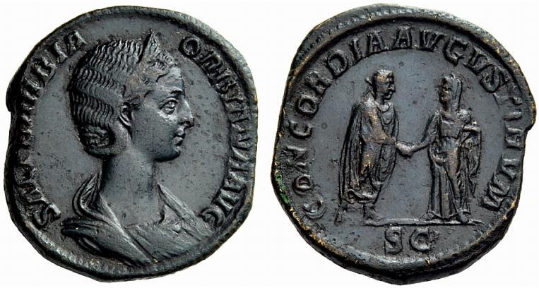 The Roman Republic. Orbiana, wife of Severus Alexander. Sestertius 225, Æ 18.40g. Diademed and draped bust r. Rev. Alexander and Orbiana clasping hands. C 6. BMC S. Alexander 299. RIC S. Alexander 657. Rare. Dark tone, edge uneven, otherwise good very fine