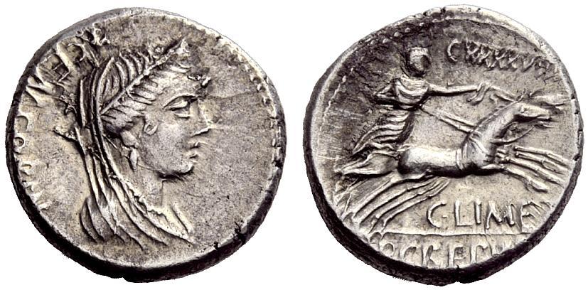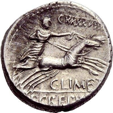 The Roman Republic, P. Crepusius, C. Limetanus and L. Censorinus. Denarius 82, AR 3.78 g. L CENSORIN Diademed, draped and veiled bust of Venus r. Rev. Venus in fast biga r.; above, CXXXXVX. Below horses, C LIMET. In exergue, P CREPVSI. Babelon Crepusia 3, Mamilia 9 and Marcia 27. Sydenham 736a. Crawford 360/1b. Lightly toned and about extremely fine