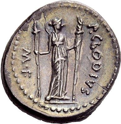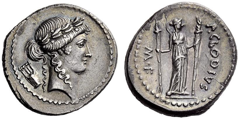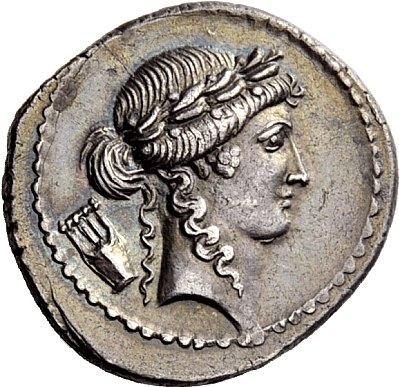 The Roman Republic. P. Clodius M.f. Turrinus. Denarius 42, AR 3.92g. Laureate head of Apollo r.; behind, lyre. Rev. P.CLODIVS–M·F Diana standing facing, with bow and quiver over shoulder, holding lighted torch in each hand. Babelon Clodia 15. Sydenham 1117. Sear Imperators 184. Crawford 494/23. Old cabinet tone and good extremely fine