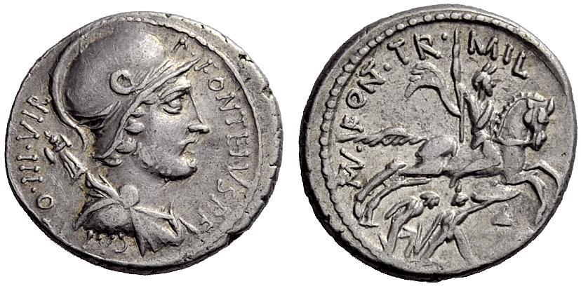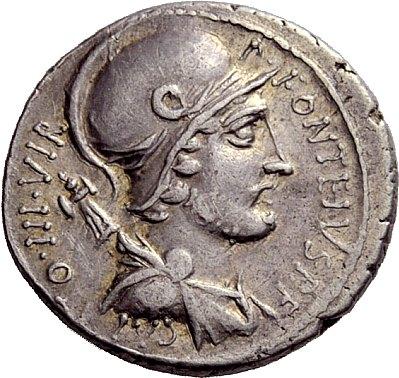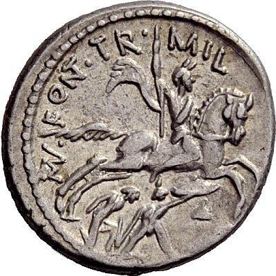 The Roman Republic. P. Fonteius P.f. Capito. Denarius 55, AR 3.71 g Helmeted and draped bust of Mars r., with trophy over shoulder. Rev. Horseman r., thrusting spear at enemy who is about to slay unarmed captive; in r. field, helmet and oval shield. Babelon Fonteia 17. Sydenham 900. Crawford 429/1. About extremely fine